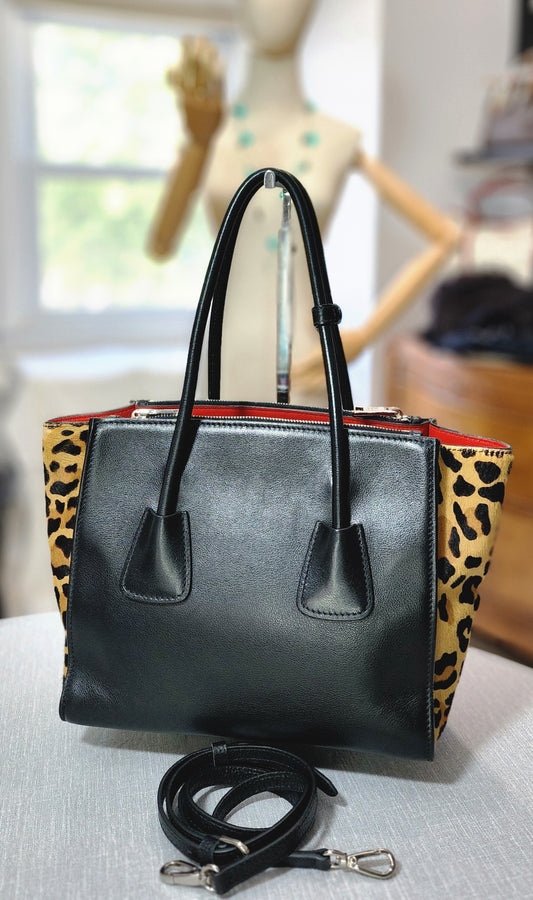 Prada Black Leather and Leopard Print Calf Hair Twin Bag