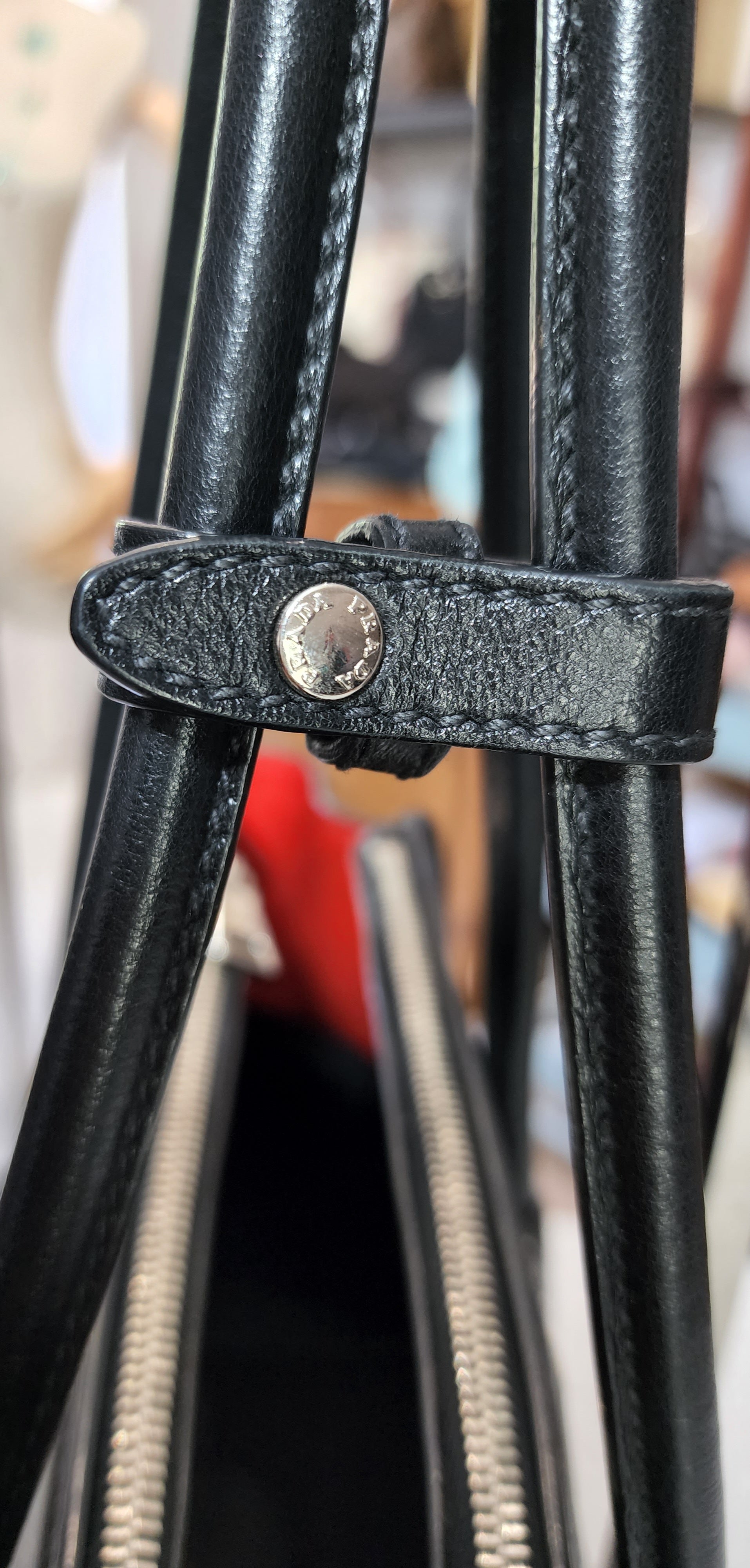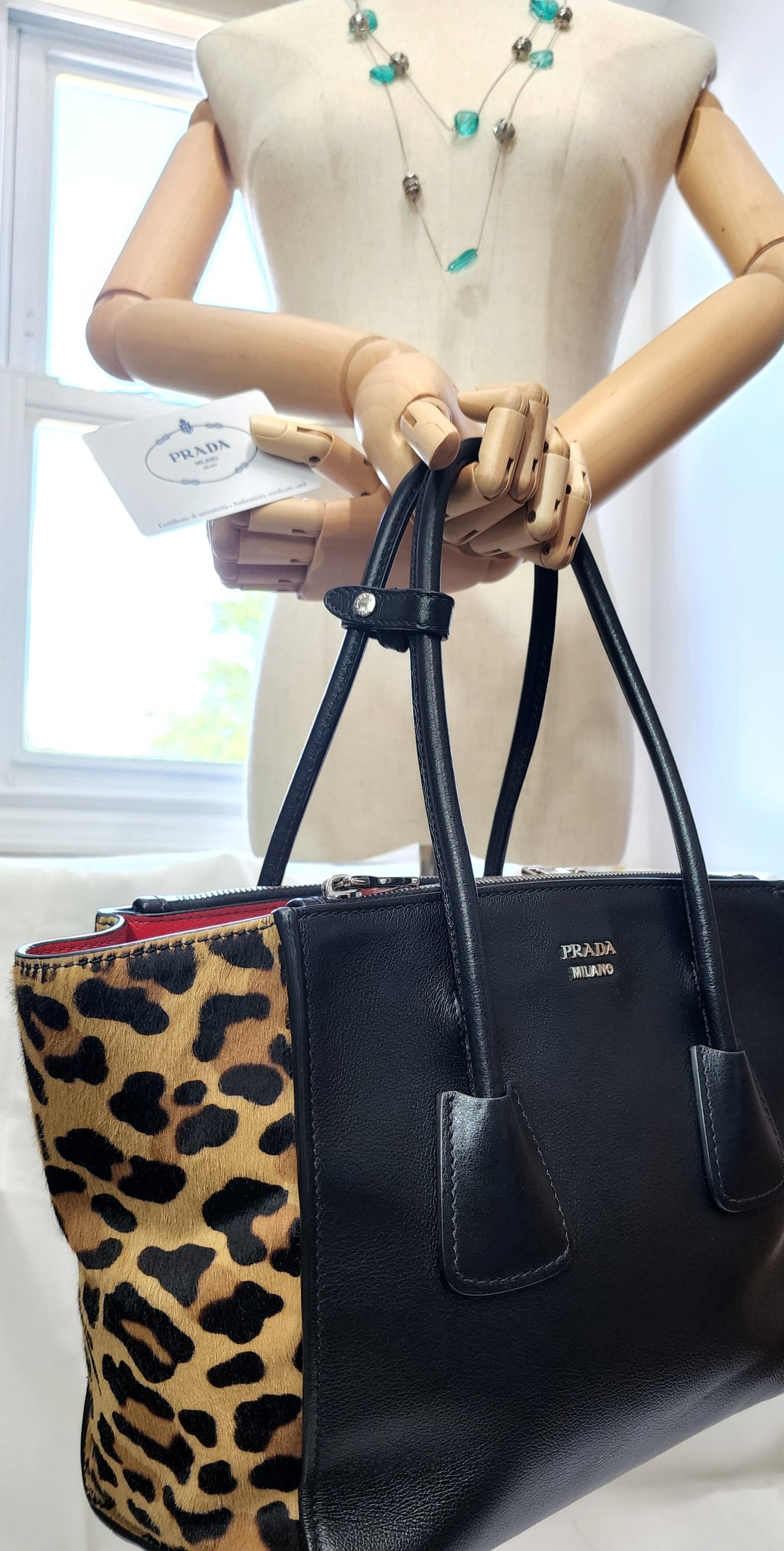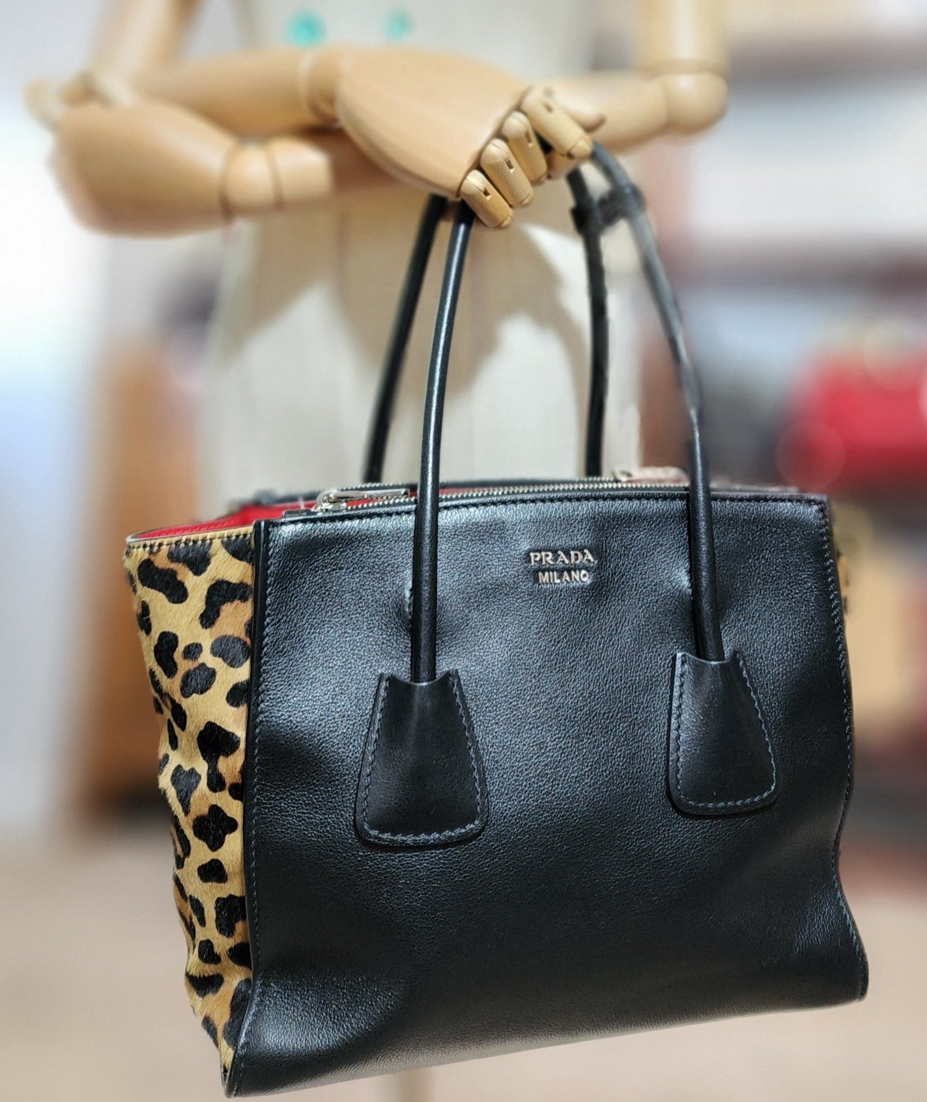 Prada Black Leather and Leopard Print Calf Hair Twin Bag