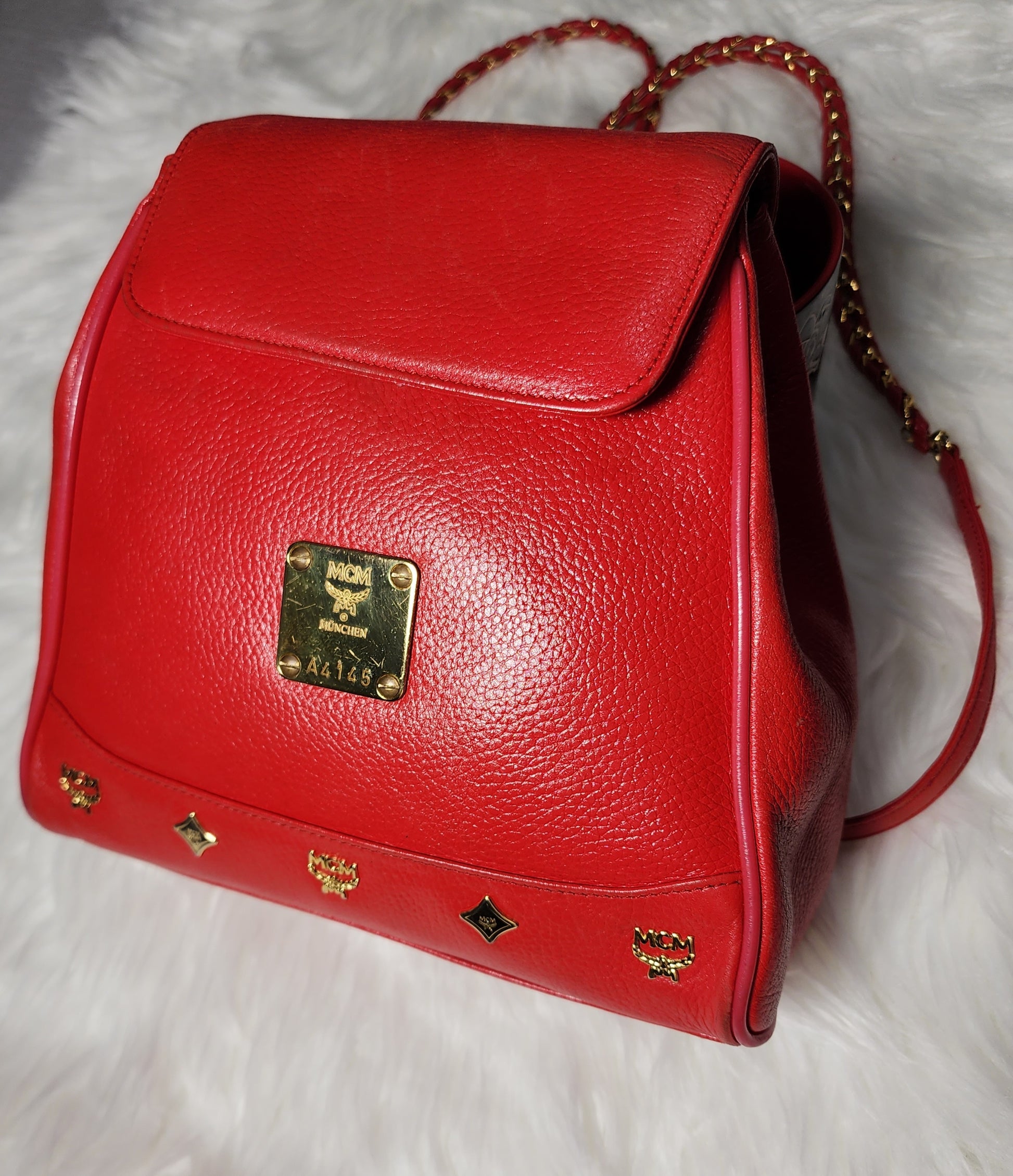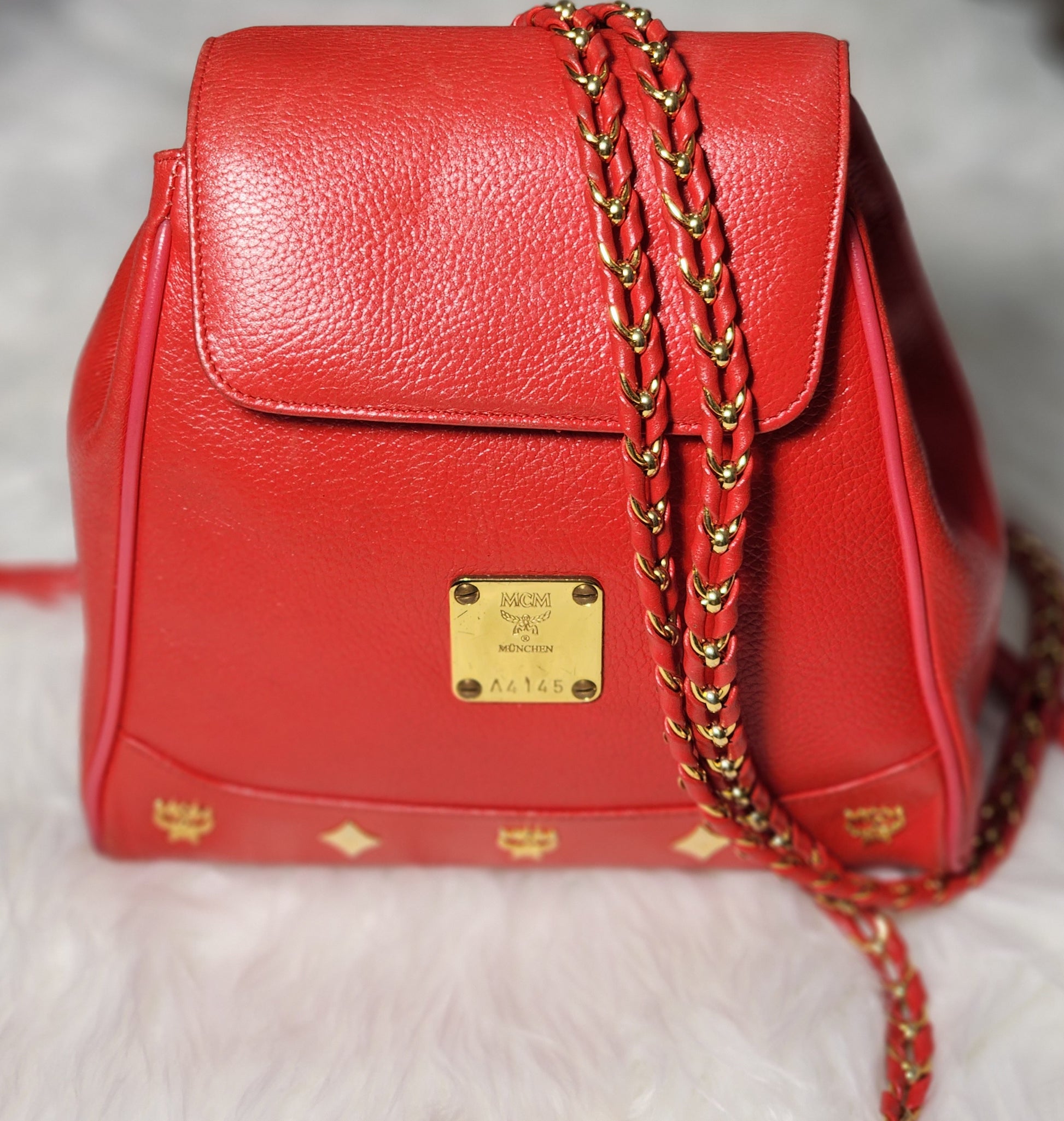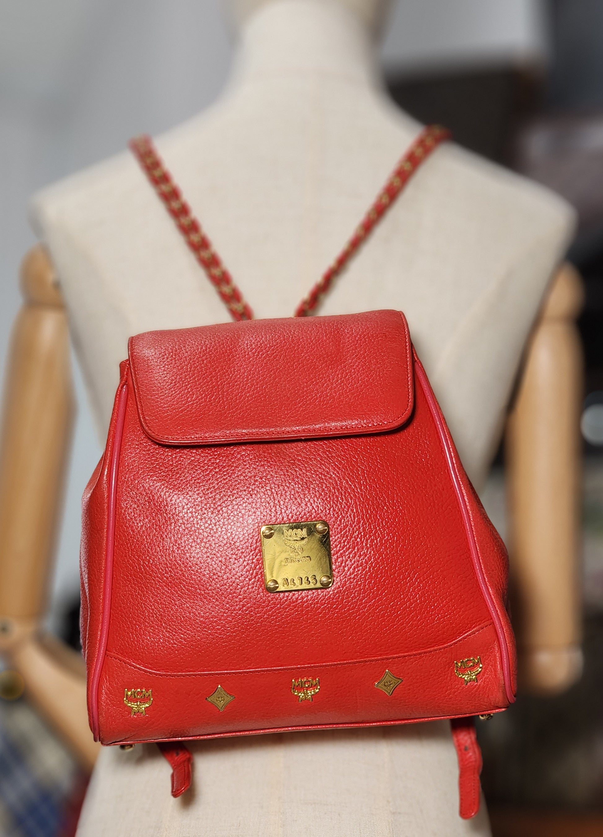 MCM Vintage Red Leather Braided Chain Small Backpack
